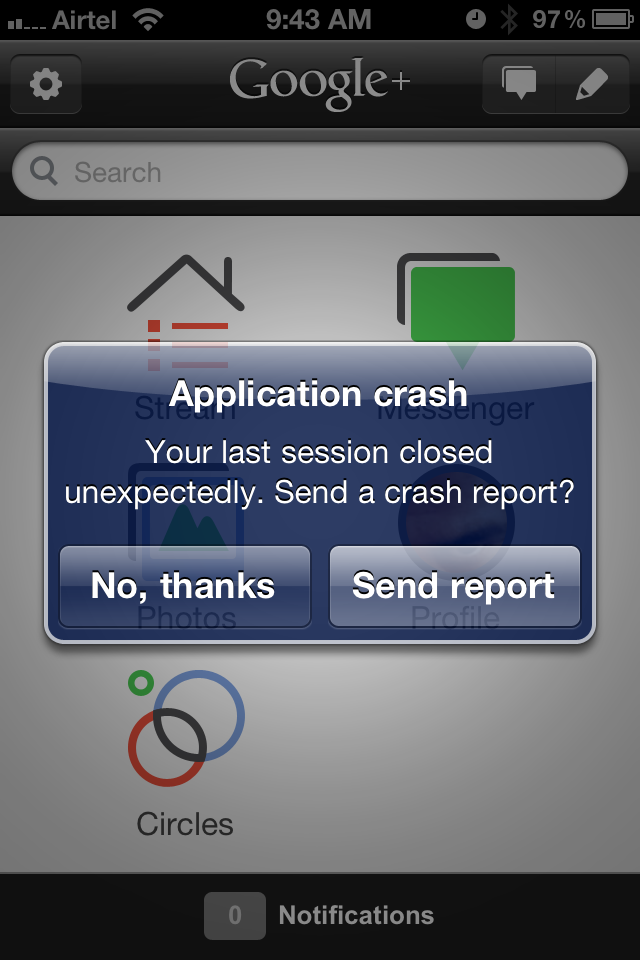 App consistently crashes when trying to upload picture from the iPhone library. Default sharing selection is to your circles, but when I add public, app crashes. Ironically, the update was supposed to enable full resolution photo uploads.
